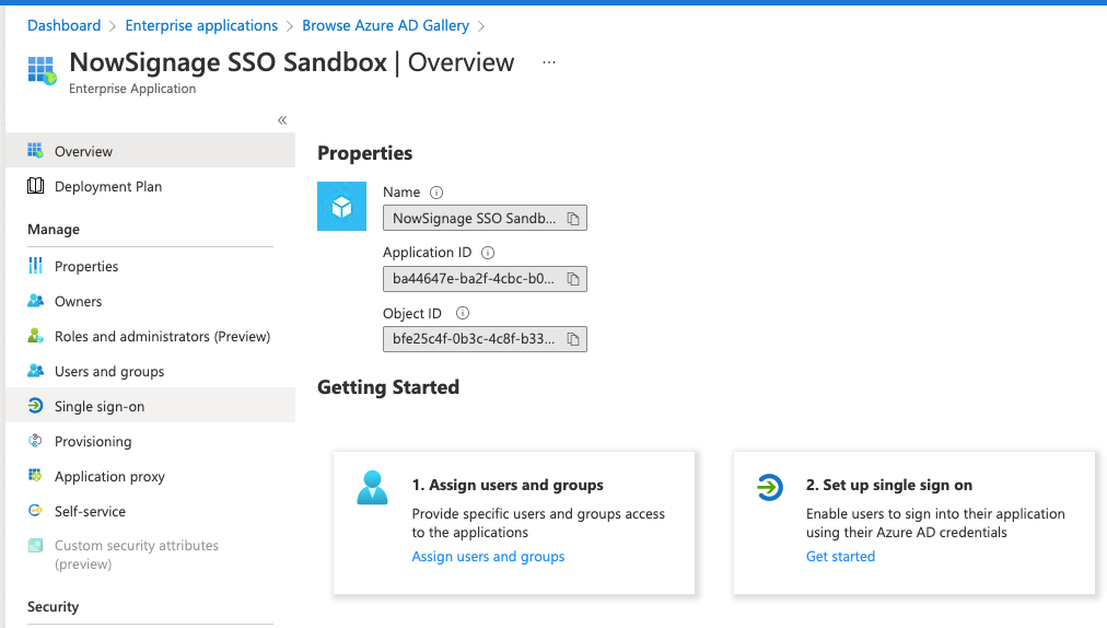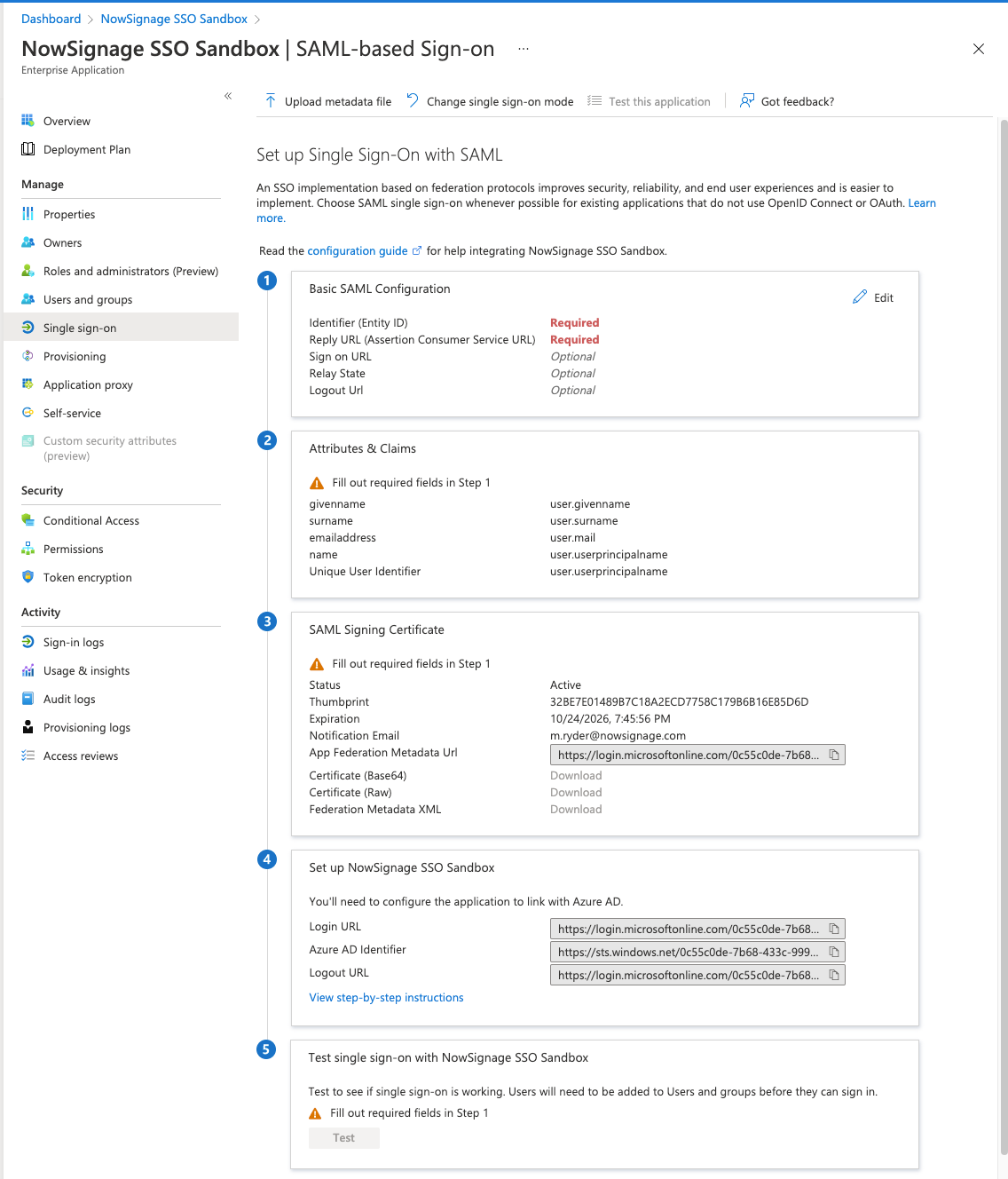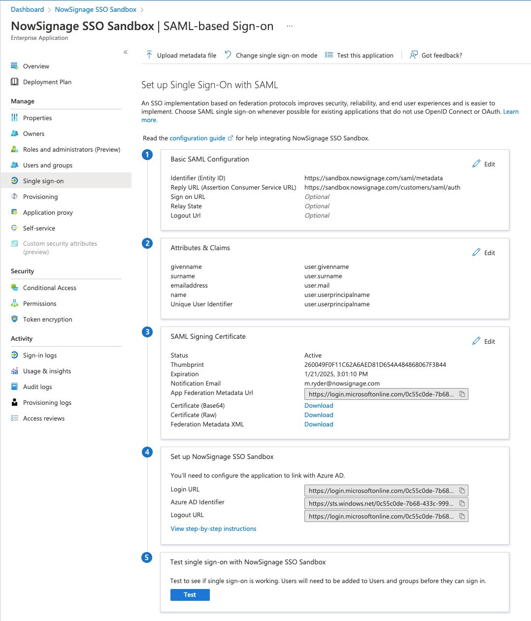 7. Una vez completado, Azure creará algunas URL y el certificado necesario para SSO en NS.