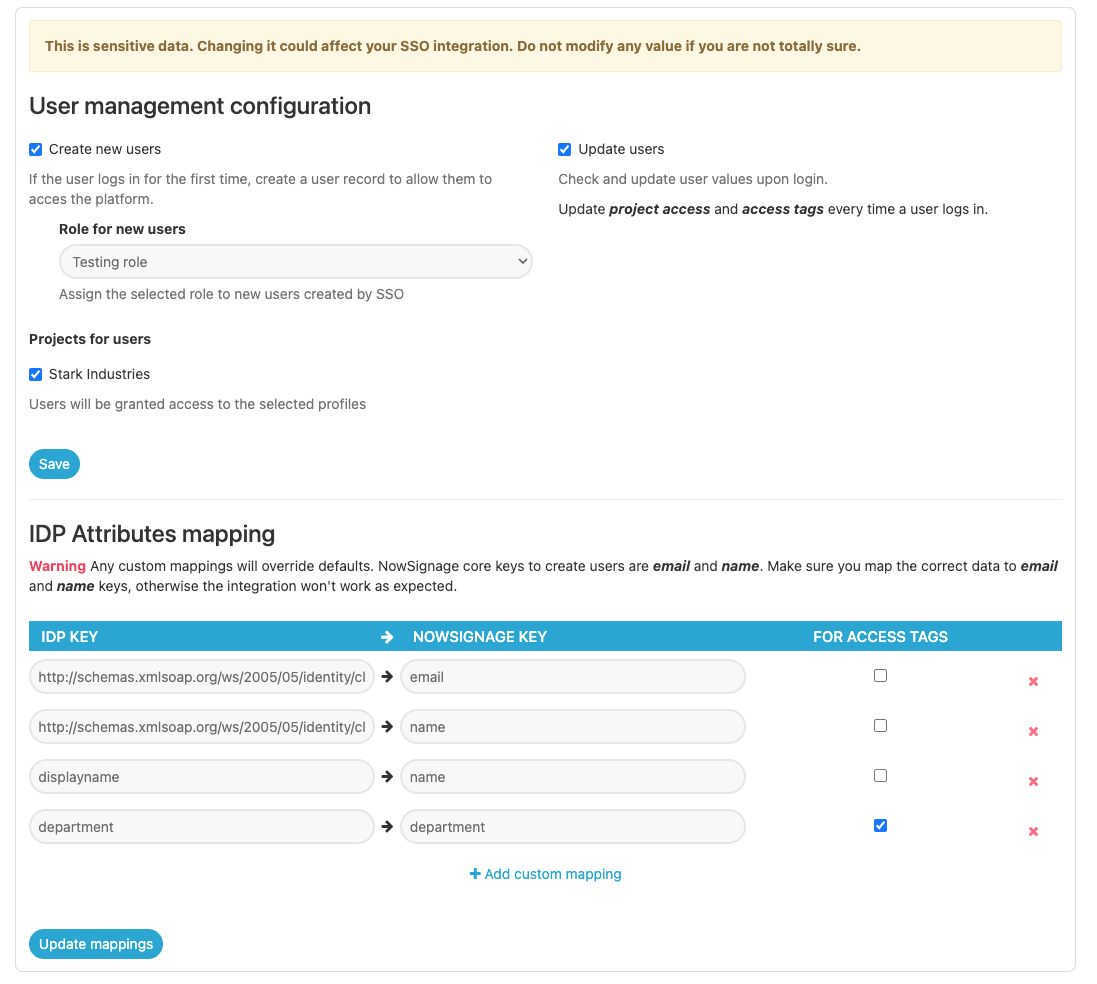Si la casilla de verificación Actualizar usuarios está seleccionada, entonces cada vez que un usuario inicie sesión usando SSO, el sistema realizará una actualización del usuario. Verificará y actualizará el rol del usuario, el acceso a los proyectos y las etiquetas de acceso, para los que estén configurados en esta sección. Entonces, si en algún momento modificas tus configuraciones, esto actualizará el acceso de los usuarios para reflejar tus nuevas configuraciones cuando inicien sesión nuevamente en NowSignage.