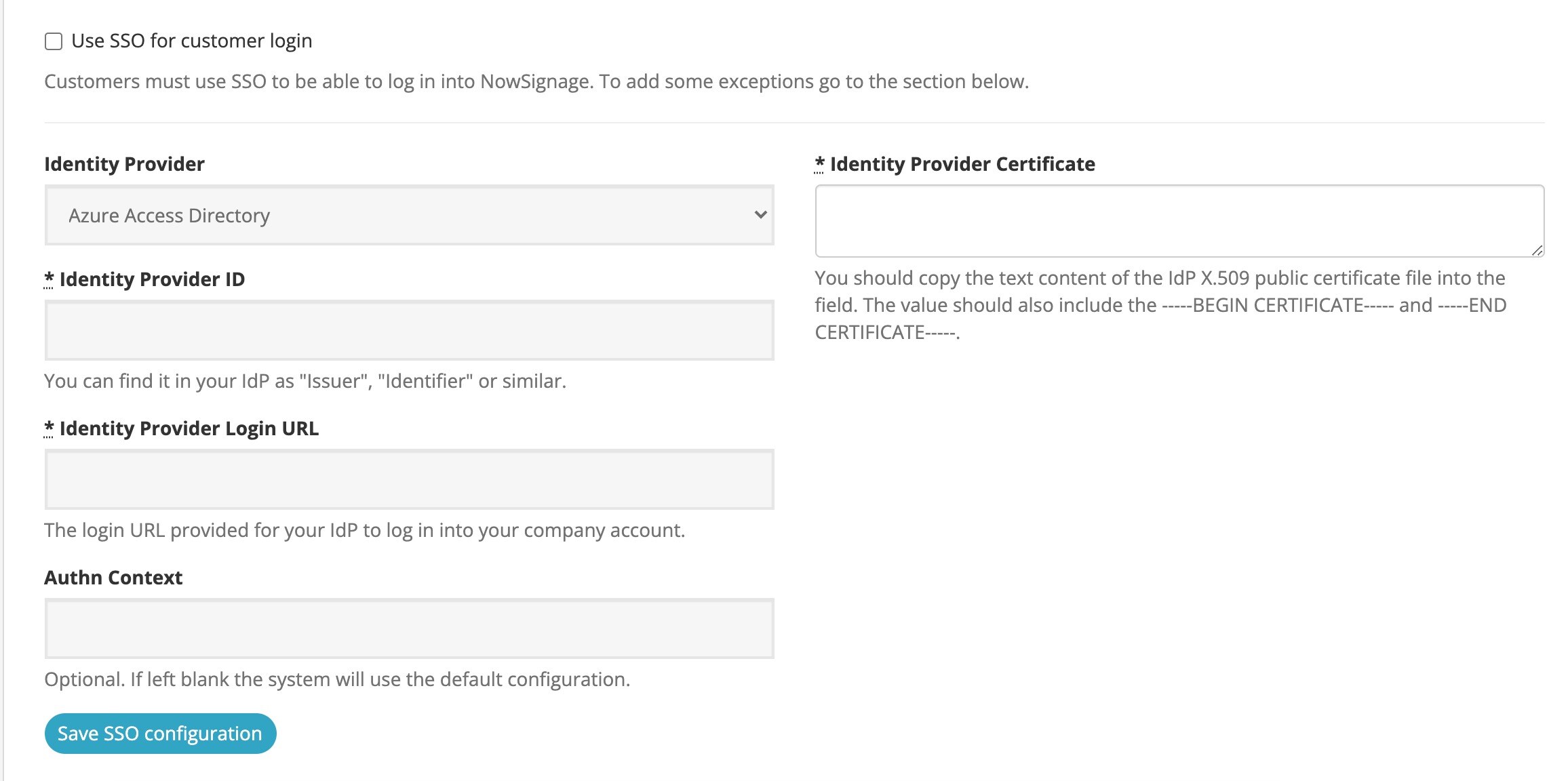 Para configurar SSO en su cuenta de NowSignage, siga los pasos a continuación: