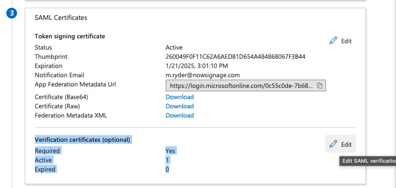 Es posible habilitar un certificado de verificación dentro de la aplicación NowSignage SSO, para hacerlo dentro de Azure, por favor edite el área que se muestra a continuación: