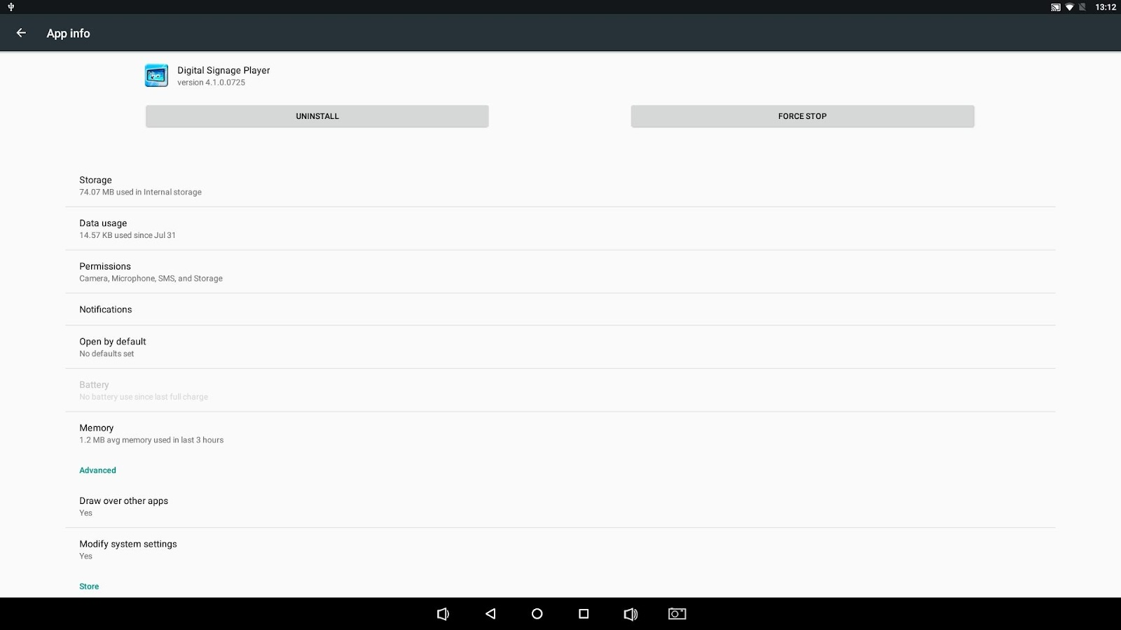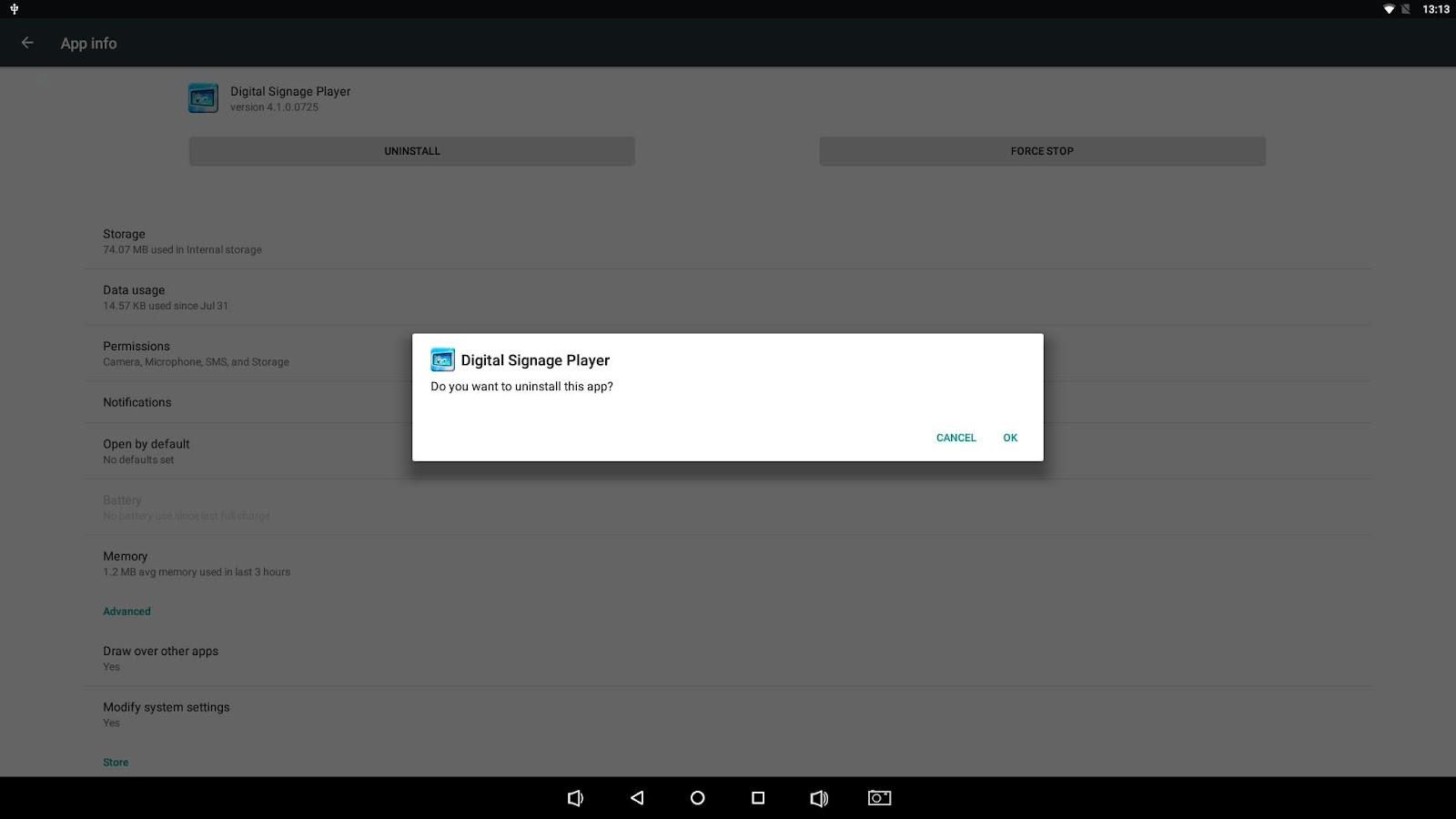 Eliminando la aplicación de señalización digital. Tenga en cuenta: Si la unidad no arranca en la aplicación predeterminada Digital Signage Player (mostrada a continuación), entonces salte a la sección "Instalación de la aplicación Now Signage".