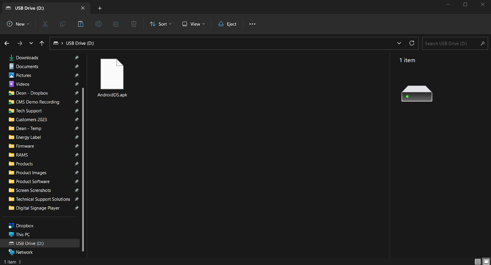 - Dispositivo de almacenamiento externo USB que contiene el APK de NowSignage