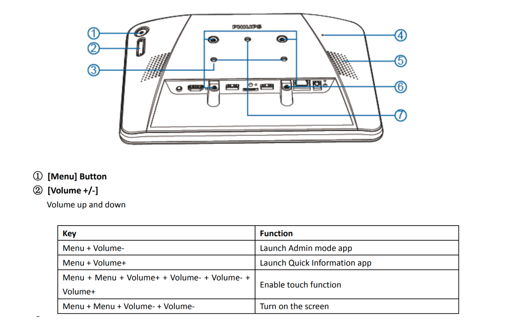 Paso 1: Inicie la aplicación del modo Menú de Administrador presionando simultáneamente el botón Menú y el botón de Volumen Abajo (-), vea la imagen a continuación: