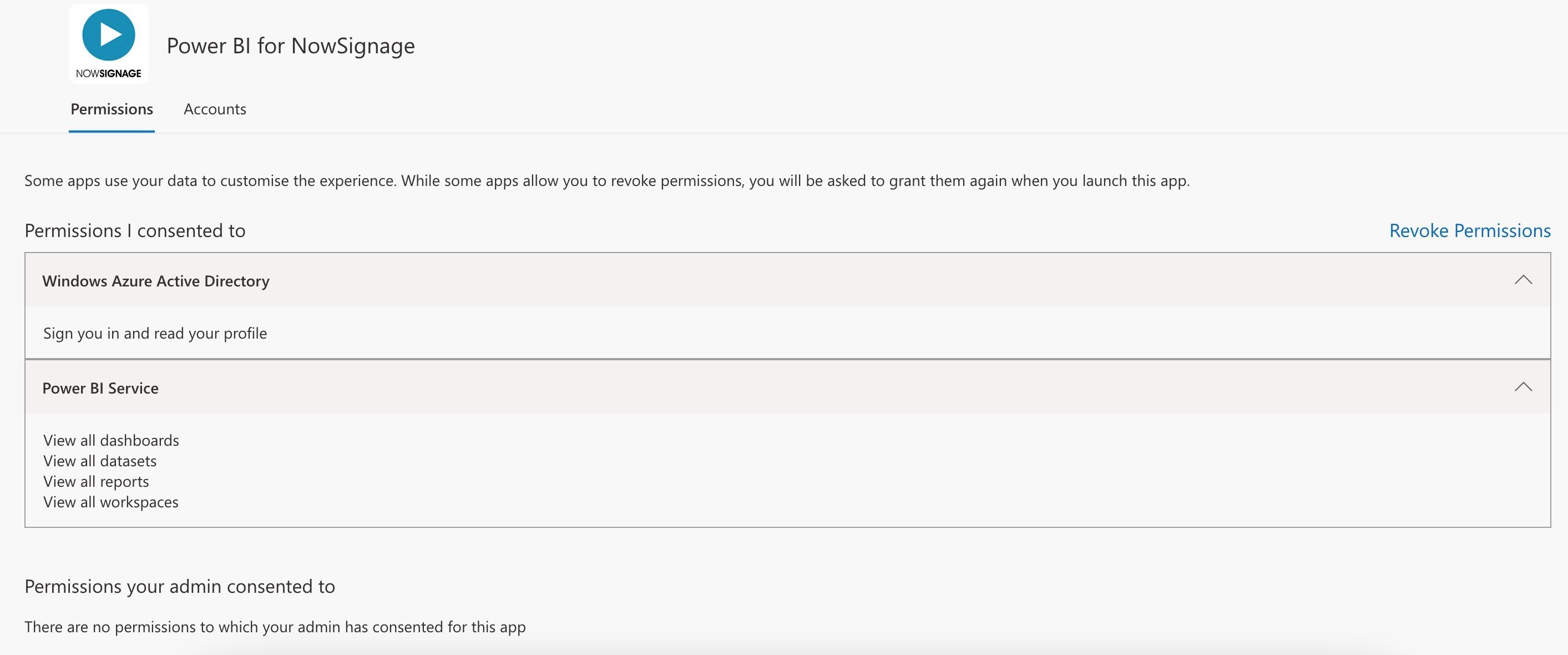 Al conectar tu cuenta de Power BI en NowSignage, necesitarás consentir las siguientes permisos: