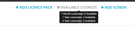 After your pack code has been redeemed, you can review your available licences by hovering over the licence count to see how many are ready to assign to your screens.