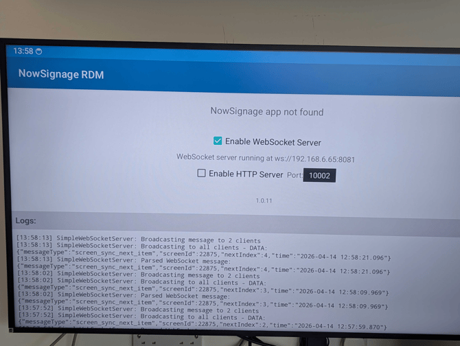 - Set up Android media player independently with only the NowSignage RDM installed and enable WebSocket server ticked - Download here - https://knowledgebase.nowsignage.com/android-remote-device-management-rdm